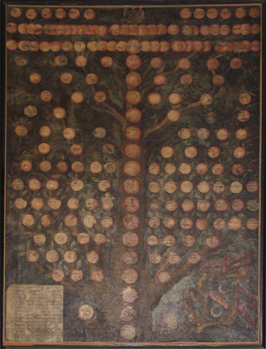 L’albero genealogico più antico della casa Compagnoni Floriani, realizzato da Pompeo Compagnoni Senior riporta le generazioni dal 1055 sino al 1600. Sul retro la seguente dicitura: