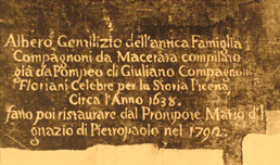 Il primo documento in ordine cronologico custodito nell’archivio Compagnoni Floriani consiste in una pergamena risalente al 1060, menzionata da Pompeo Compagnoni senior nella sua Reggia Picena, recentemente catalogata ed ora in fase di studio, testimonianza del « cognomentus » Compagnone.